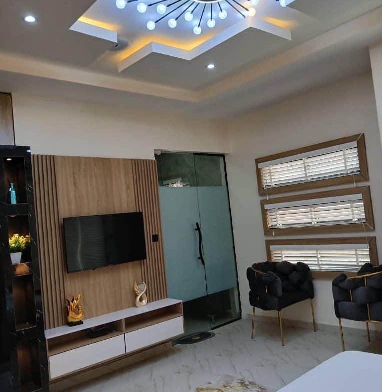 Spacious sitting room and royal ensuite room with Super king bed, modern bathroom and toilet 🚽. Very clean and standard apartment. Royal Pent House gives you all modern comfort beyond your imagination with unlimited high speed WiFi, 43inchSmart Tv in the bedroom and 55inch Smart Tv in the sitting room, YouTube, Netflix, DSTV. Comfortable Sofa, Water heater, Water kettle, Microwave, Cooking gas. Smoke Alarm, Mono dioxide Alarm, 24/7 power. , Cctv, maximum security with 24/7 security personnel