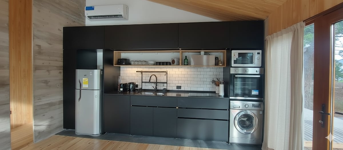Incroyable micro-maison en béton au milieu de la forêt, respectant la nature du lieu, environnement unique avec un lit queen size, un bureau, 2 chaises et le Wi-Fi. Salle d'eau avec douche, lavabo, wc. Kitchenette avec évier, plaque électrique, micro-ondes et réfrigérateur avec congélateur, elle n'est PAS pour cuisiner. Très lumineuse avec la mer à 700 m et le centre commercial à 600 m. Cette belle maison est cachée derrière la maison principale avec une intimité et une autonomie totales. Barbecue extérieur à usage commun du lieu. Bienvenue !