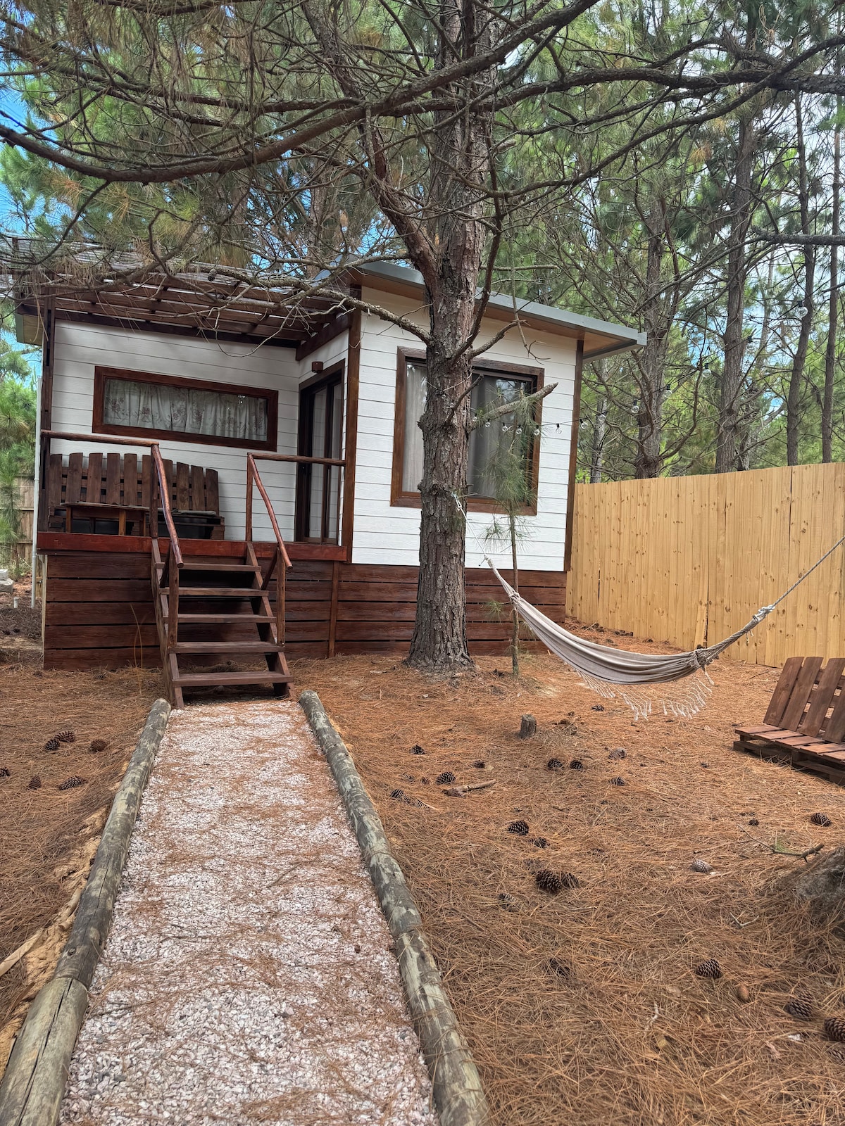 Cabaña de madera cálida y artesanal definida en un monoambiente amplio para 3 adultos equipada con todos los electrodomésticos nuevos imprescindibles para cocinar, menaje completo, cómodos colchones y un bonito deck para descansar en las reposeras. También cuenta con un pequeño parrillero en un costado lateral con un buen acceso a la cabaña.