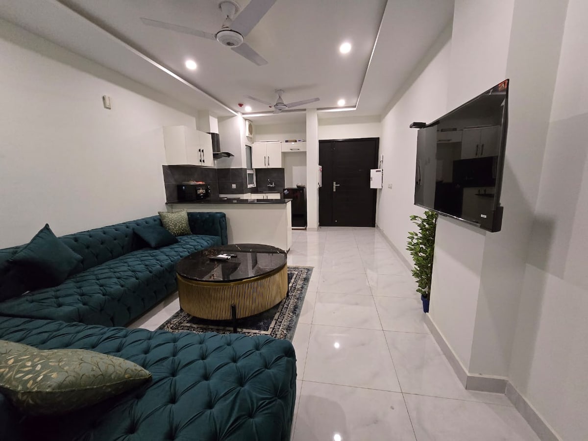 Nous proposons un élégant appartement d'une chambre à DHA Phase 4, Lahore, avec un accès facile aux attractions locales. L'appartement dispose d'un lit king size confortable, d'une cuisine entièrement équipée et d'un salon spacieux. Profitez d'une terrasse privée. Les équipements supplémentaires comprennent une connexion Wi-Fi, la climatisation, un four à micro-ondes et un lave-linge. À leur arrivée, les voyageurs doivent présenter une pièce d'identité valide. Veuillez noter que les fêtes bruyantes, les fumeurs à l'intérieur et les voyageurs non enregistrés ne sont pas autorisés. Les couples non mariés ne s'adapteront pas.