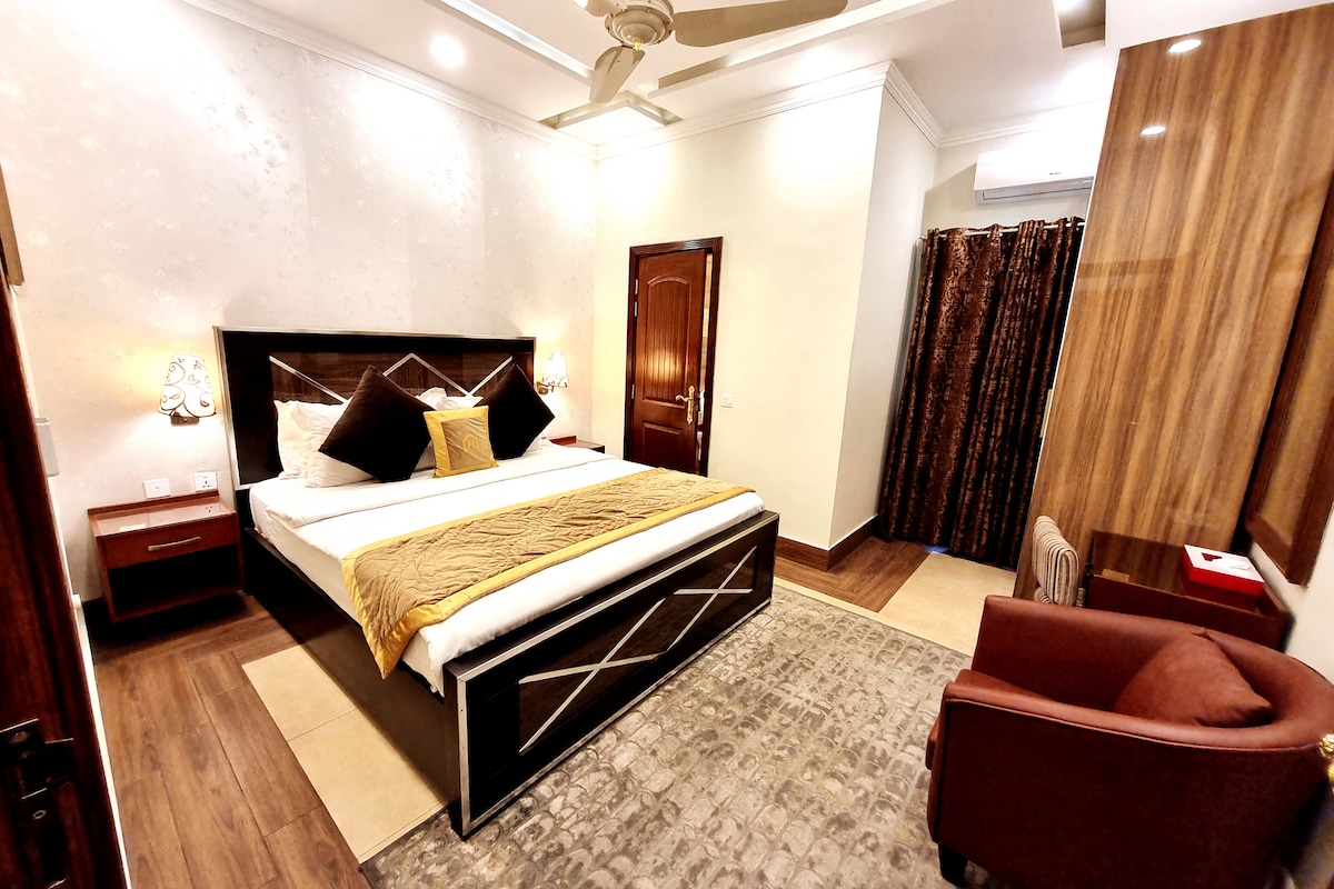 Hôte : The Royal Escape Pakistan Une escapade romantique au cœur de Lahore ! Cet élégant penthouse climatisé d'une chambre sur Mall Road se trouve à quelques minutes de Badshahi Masjid, Shahi Qila et Anarkali. Profitez d'un lit King Size, d'une télévision connectée, d'un éclairage confortable, d'une cuisine entièrement équipée et d'une connexion Wi-Fi gratuite. Idéal pour les couples, les voyageurs en solo ou les petites familles, à seulement 25 minutes de l'aéroport !