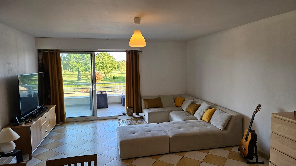 Appartement spacieux de 70 m2 au Golf du Pays de Saint Gilles avec vue sur la piscine et sur le parc. Il se situe dans une résidence avec ascenseur au 2 eme étage. Vous disposez de 2 chambres : une avec 1 lit double et une chambre avec 2 lits simples, de 2 salles de bain avec douche/baignoire et WC séparé. La cuisine toute équipée est ouverte sur un salon séjour avec fauteuils, canapés et 1 coin TV. Le ménage compris durant le séjour. Les draps sont en option à 10€/personne