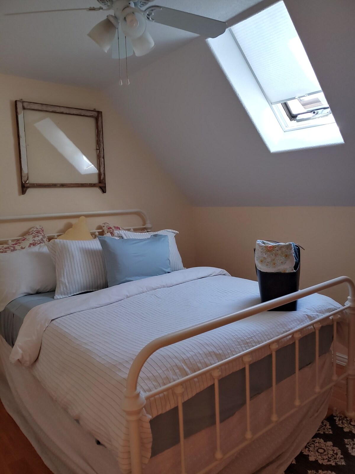 Ce chalet de 2 chambres est situé au-dessus de notre garage. C'est paisible et calme dans notre quartier. Nous offrons 2 lits flambant neufs et une literie confortable. La vue de nuit est incroyable. Parfois, on a l'impression de pouvoir toucher les étoiles. La cuisine est entièrement approvisionnée et si vous avez besoin de quelque chose en plus, n'hésitez pas à nous le faire savoir. Le plus intéressant, c'est notre emplacement, nous sommes proches de tout. Nous n'annulerons pas votre réservation. Notre chalet est votre espace personnel, il sera soigneusement nettoyé et désinfecté.