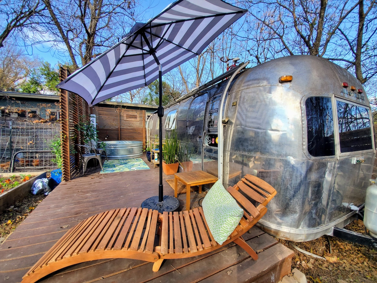 L'Airstream est entièrement rénové avec un lit queen size confortable, climatisation froide, télévision connectée, station de café, petite cuisine, espace de travail et terrasse extérieure avec jacuzzi/piscine cow-boy et transat. Vous aurez accès à la maison avec votre propre salle de bain et douche privées. Nous sommes juste à côté d'un tas de bars, de cafés et de restaurants locaux. Également proche du centre-ville ou de l'est de la 6e rue. Mon logement est parfait pour les couples, les aventuriers en solo et les voyageurs d'affaires.