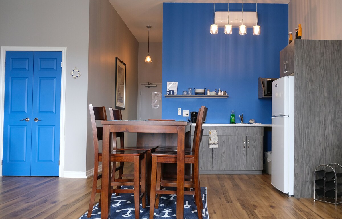 Situé sur la rue historique West dans le centre-ville de Port Colborne. Notre plus grand studio avec 2 lits Queen Size et un canapé convertible King Size. Kitchenette avec salle de bain privée. Télévision connectée avec Wi-Fi. Proche de toutes les commodités locales, y compris la plage, la marina, le musée et de nombreux commerces et restaurants. Laissez votre voiture à la maison et profitez de l'ambiance de la côte Est de Port. Pas de vue sur le canal depuis la chambre.