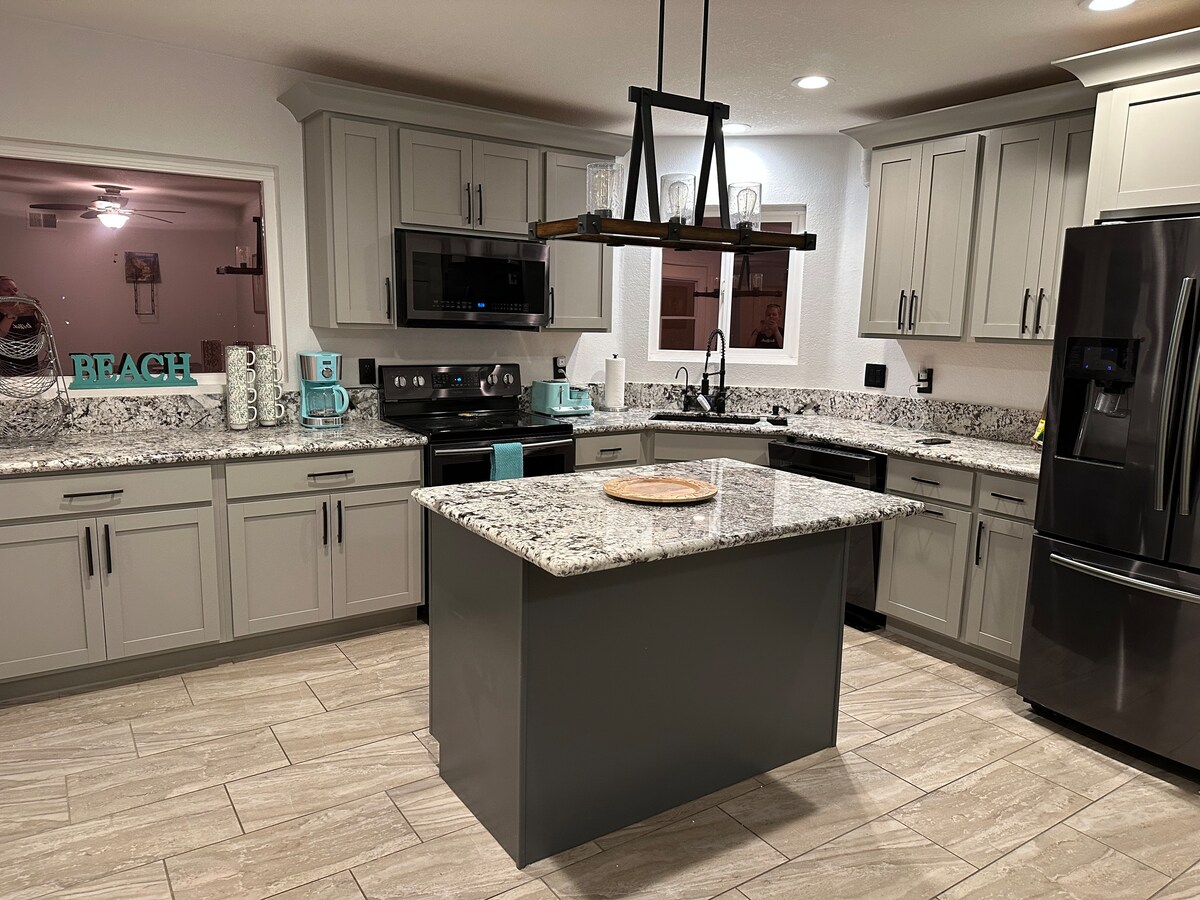 Grande cuisine entièrement équipée, literie et mobilier haut de gamme, confortable, tentaculaire, proche de tout avec tous les équipements. Plafonds de 10'de haut, toute nouvelle construction, TV LED 65"avec son surround. Parfait pour 2 familles à la recherche de vacances à court/long terme, y compris un forfait-n-play, des jeux pour enfants et des jouets. Entrée sans clé pour l'accès et les bâtons coupe-feu pour chacun des 3 téléviseurs. Barbecue dans le jardin avec évier et réfrigérateur. Lave-linge/sèche-linge intérieur. Accès garage 2 voitures, profondeur bateau. Prenez quelques courses ou commandez