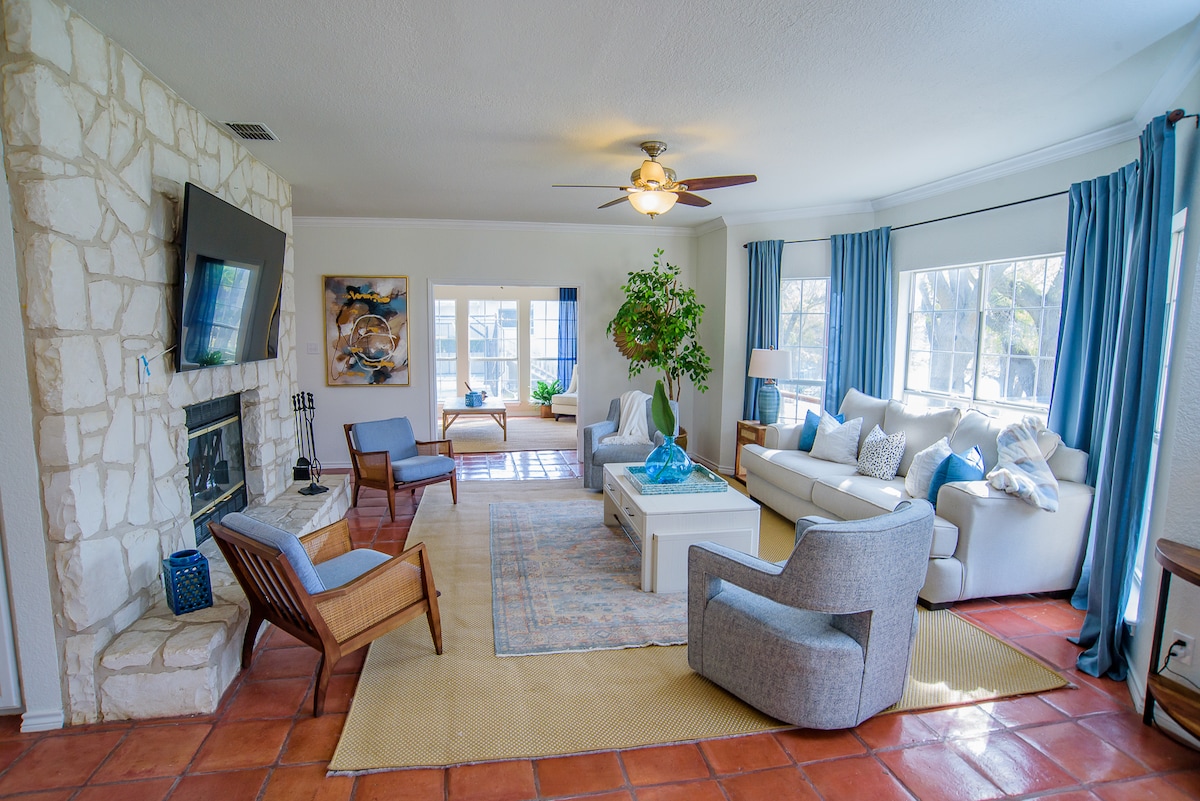 Nestled along the Guadalupe River, Pecan Grove Retreat offers a prime location midway between Austin and San Antonio. Ideal for two families, the home boasts various amenities including three kayaks, a paddle board, ping pong table, foosball table, hammock, hammock chairs, fire pit, and charcoal grill. Enjoy a perfect blend of relaxation and recreation. Close to New Braunfels (25min), San Antonio (45min), Austin (1hr) and Houston (2.5hrs) Corpus (2.25hrs)