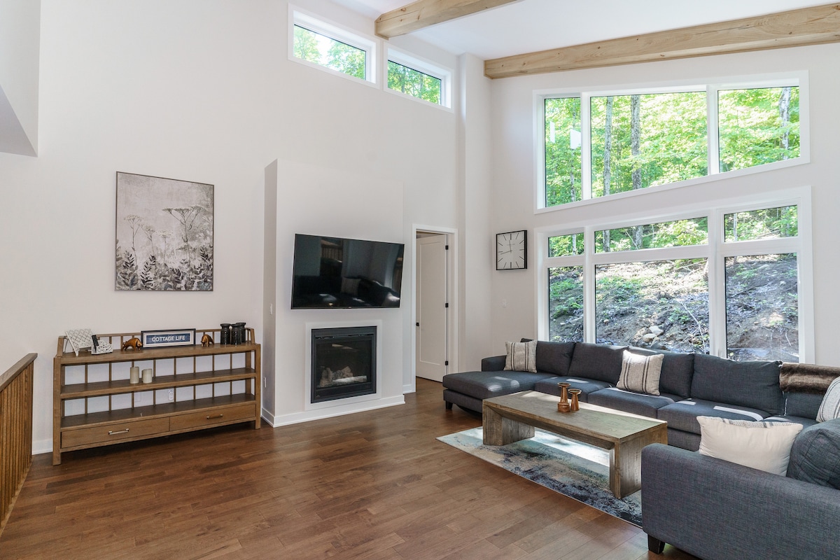 Bienvenue à Muskoka A-frame, l'escapade parfaite pour les couples ou les retraites en solo. Détendez-vous dans le *JACUZZI**. Réveillez-vous avec les cimes des arbres qui se balancent, jouez à des jeux de société et écoutez des albums près du feu, avec une vue sur la forêt à 2 étages. Cette cabane classique en forme de A des années 70 a été réinventée pour le monde moderne. Nichez-vous ou faites-en votre base pour 4 saisons d'aventure. Randonnée, raquettes ou ski de fond Limberlost, ski/snowboard Hidden Valley, patin à travers la forêt d'Arrowhead et visitez Huntsville pour les restaurants, les brasseries et les commodités locales