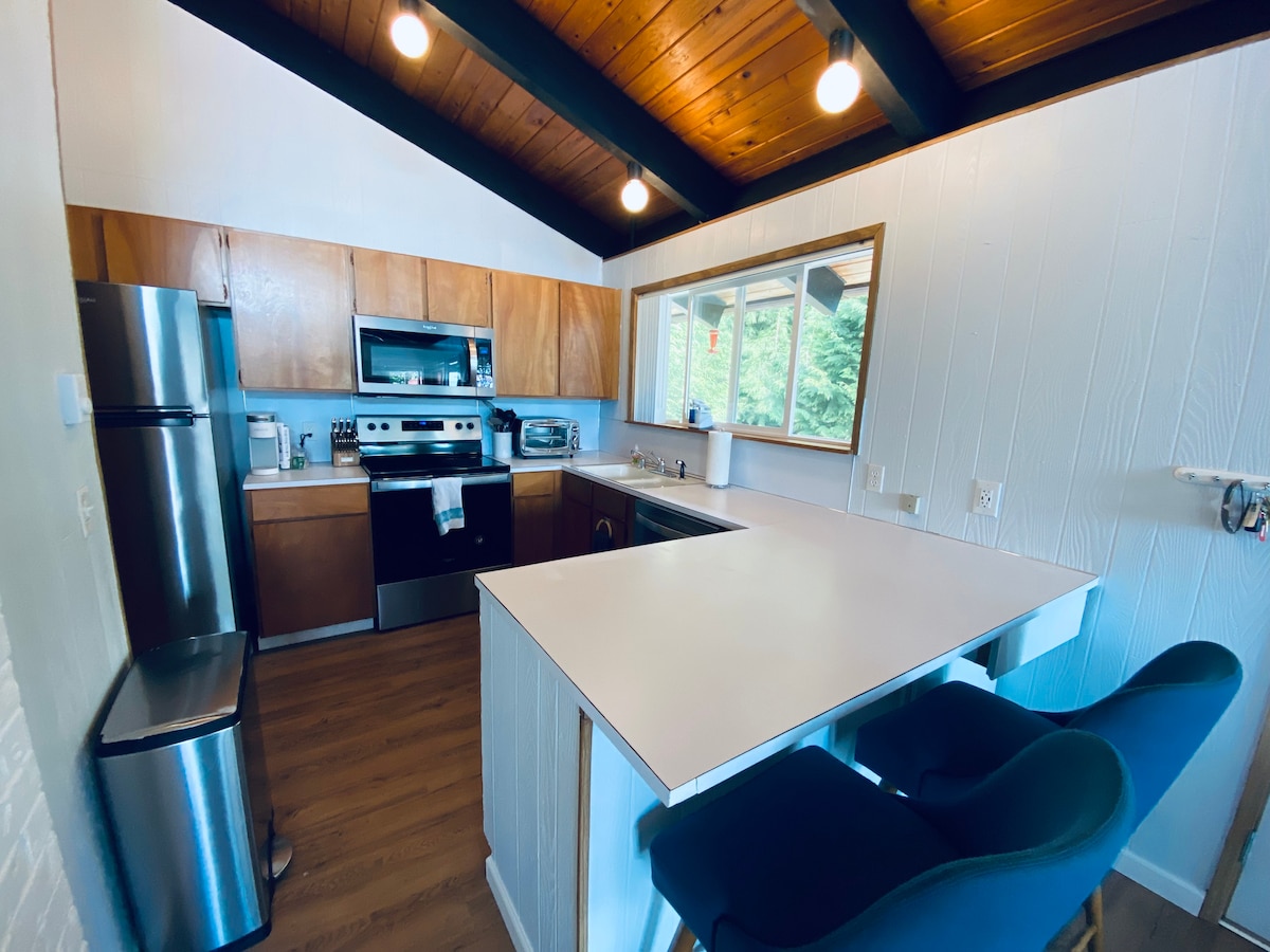 La Trails End House est un chalet de 2 chambres et 2 salles de bain en bord de mer des années 1950. C'est une escapade pour ceux qui souhaitent se réinitialiser et se détendre tout en profitant de tout ce que Whidbey Island a à offrir. Sirotez un café local en admirant une vue à 180 degrés sur le mont Baker, la chaîne de montagnes Cascades et le port de Holmes fréquenté par les baleines grises. Promenez-vous jusqu'à la ferme. Accès privé sur la plage via un sentier verdoyant. La nouvelle mini chaleur fendue et la climatisation viennent d'être installées !
