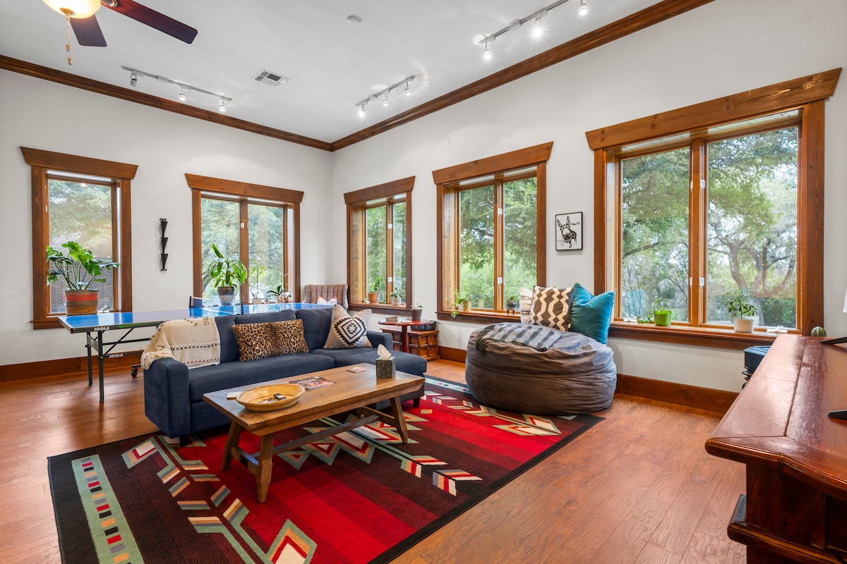 Une vue à un million de dollars depuis une cabane moderne nichée au-dessus des arbres surplombant Barton Creek. Situé dans un quartier fabuleusement rural, à seulement 12 miles du centre-ville d'Austin. La cabane indépendante est funky, élégante et super confortable ! Elle dispose d'une chambre loft avec lit queen size et d'un canapé convertible queen size confortable dans le séjour. L'accès au ruisseau se fait par un sentier pour les aventuriers ! Cette propriété privée et exclusive est totalement séparée de la maison principale et est accessible par son propre portail.