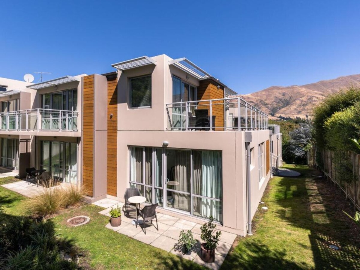 Cette spacieuse maison de ville de villégiature de Wānaka est idéale pour 4 amis ou une famille. 2 chambres avec lit King Size - ou échangez une chambre EN DEMANDANT 3 JOURS À L'AVANCE pour 2 lits King Size simples. Toutes ont des matelas Dreamfoam, 2 salles de bains chauffées, la climatisation, des canapés somptueux et des œuvres d'art triées sur le volet. Vue sur la montagne, spa, piscine, court de tennis, sauna, salle de sport - un forfait imbattable ! Rendez votre voyage inoubliable avec cet appartement superbement équipé qui se trouve à quelques minutes à pied de la ville. Garanti pour offrir un séjour parfait toute l'année.