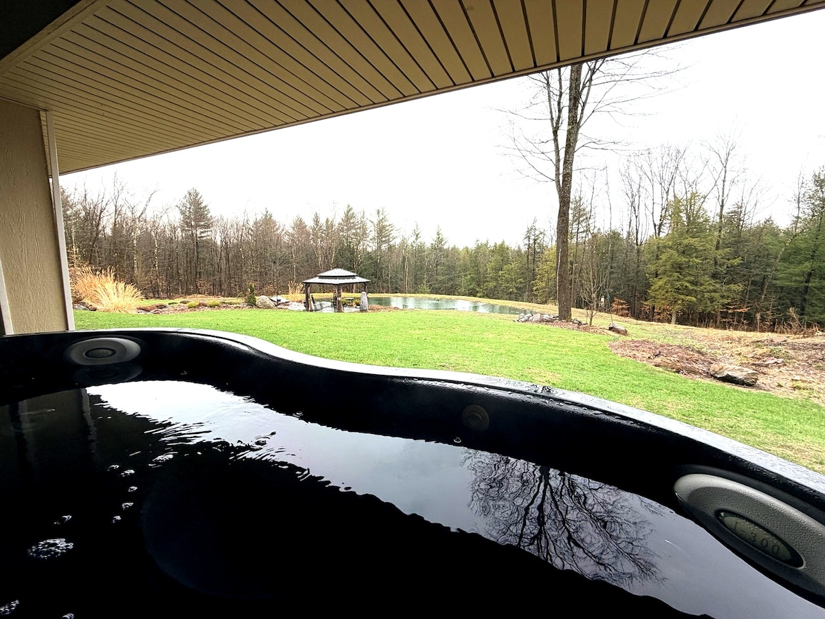 Retraite privée avec étang | Jacuzzi + foyer extérieur + bois