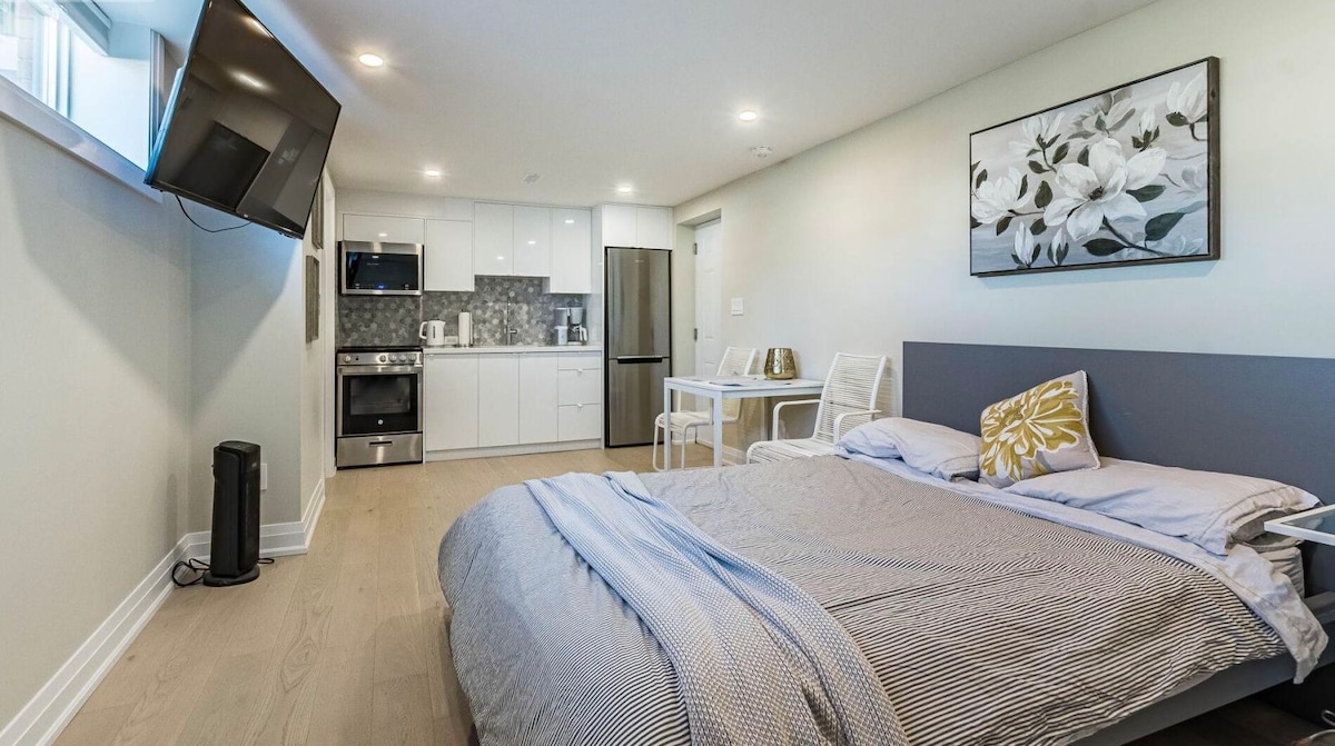 Profitez de votre séjour dans la région du Grand Toronto (GTA) avec cet espace bien aménagé, spacieux et serein. À seulement six minutes en voiture du centre commercial Sherway Gardens, à cinq minutes de deux gares différentes de GO Train et juste à côté de l'autoroute du centre-ville de Toronto. À cinq minutes à pied d'une place locale avec épicerie, pharmacie, restaurant et bien plus encore. Utilisation exclusive et à la suite au sous-sol avec des équipements modernes, y compris une cafetière Keurig, des ustensiles de cuisine Henckels, un sèche-cheveux Dyson et une télévision 55"2024.