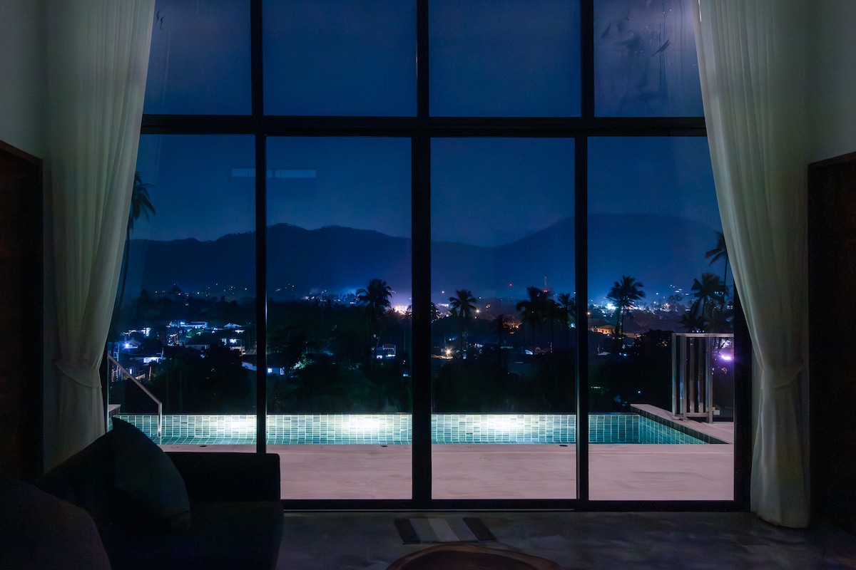 de 🚩confidentialité🚩 Nous avons eu un chantier de construction de voisin en face de notre propriété qui peut causer du bruit de perturbation pendant la journée. Veuillez nous contacter pour plus d'informations avant de réserver. Vimana est une villa contemporaine thaïlandaise meublée en bois de teck. Située à Bang Rak Pier. (Jetée vers Koh Phangan) Vous trouverez un marché local, un centre commercial communautaire, un magasin pratique, des restaurants et un salon de massage. Notre point fort est la piscine à débordement au 3e étage avec vue panoramique sur le coucher du soleil de Koh Phangan. et la chambre principale avec accès à la piscine.