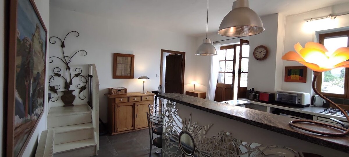Au coeur de Lanas, charmant petit village ardéchois, venez découvrir notre studio très "cocoon" et atypique, à proximité de l'Ardèche. Le logement est fonctionnel et idéal pour 2 personnes. 😍 De plain pied, il a une entrée indépendante sur une cour fermée (utile si vous avez des vélos)... L'appartement se compose d'un coin cuisine/repas très bien équipé et une chambre séparée, avec 1 lit confort (160×200cm) + 1 sdb/wc. Il est ouvert sur une belle terrasse couverte... pour le farniente🌞😎