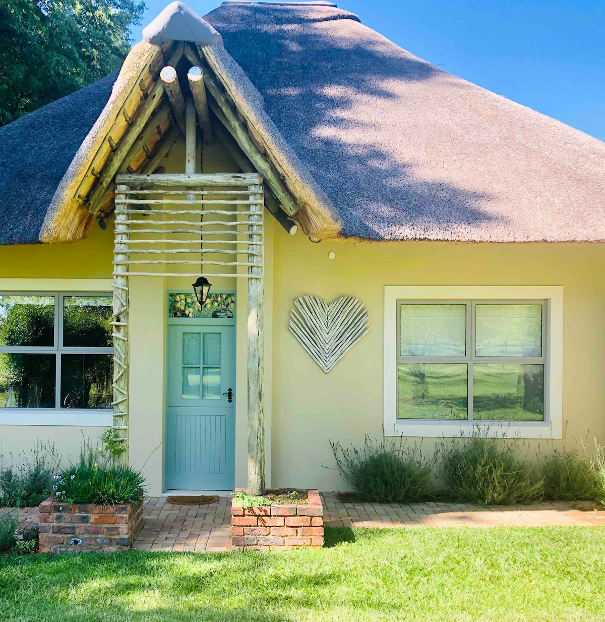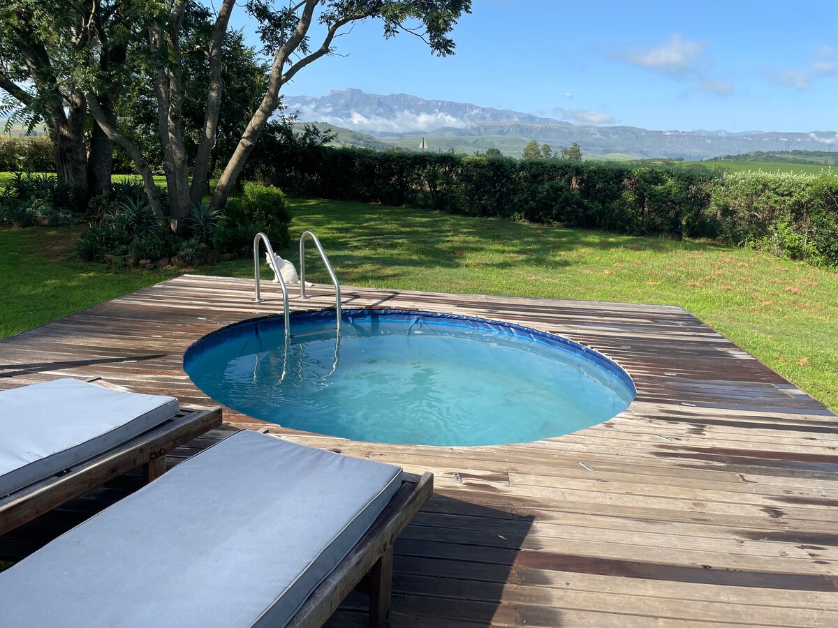Belle chaumière avec un Rondavel supplémentaire installé sur notre ferme dans le nord de la région de Drakensberg. Il dispose de son propre jardin privé avec pelouses jusqu' au bord du barrage. Dans le coin se trouve une magnifique piscine privée pour profiter des couchers de soleil lors des chaudes soirées d'été paresseuses ou pour occuper les enfants. La piscine est clôturée en toute sécurité. Idéal pour un couple ou un plus grand groupe. Belles vacances à la ferme pour tous. Bien qu'il puisse dormir 10 confortablement, il est parfait pour une escapade confortable pour seulement deux. Tu vas l'adorer.