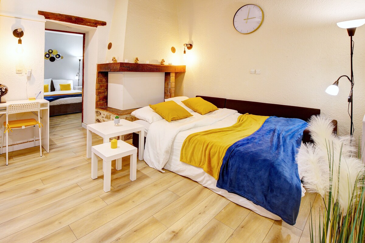 Suite de caractère situé entre Nîmes et Montpellier et à 30 min des plages. Complètement dédié à l’évasion, au repos et à la relaxation. Vous y trouverez tout le confort, un lit baldaquin queen, un vrai Jacuzzi américain 3 places, une cheminée électrique, une Tv 55', un canapé-lit, wifi et Netflix. Dans la sale de bain, vous trouverez une double vasque ainsi qu une douche. Dans la cuisine, vous trouverez le nécessaire pour réchauffer vos plats. Inclus place privé.
