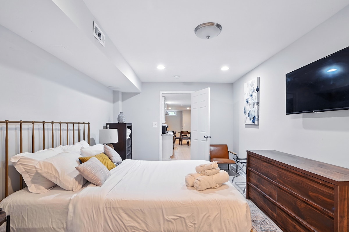 Profitez d'une charmante suite au sous-sol avec une entrée privée, un lit Queen Size avec des draps frais, une salle de bain complète, une télévision et la climatisation. La kitchenette comprend une cafetière, du café, du sucre, un micro-ondes, un mini-réfrigérateur et des ustensiles de base. Détendez-vous dans l'arrière-cour, idéale pour le café du matin. Situé près de l'aéroport de Dulles, de la vie nocturne de One Loudoun et des vignobles de Virginie du Nord. Les hôtes ont un accès privé et un parking sur place. Nous respectons votre vie privée, mais sommes disponibles pour vous aider. Réservez maintenant pour un séjour confortable !