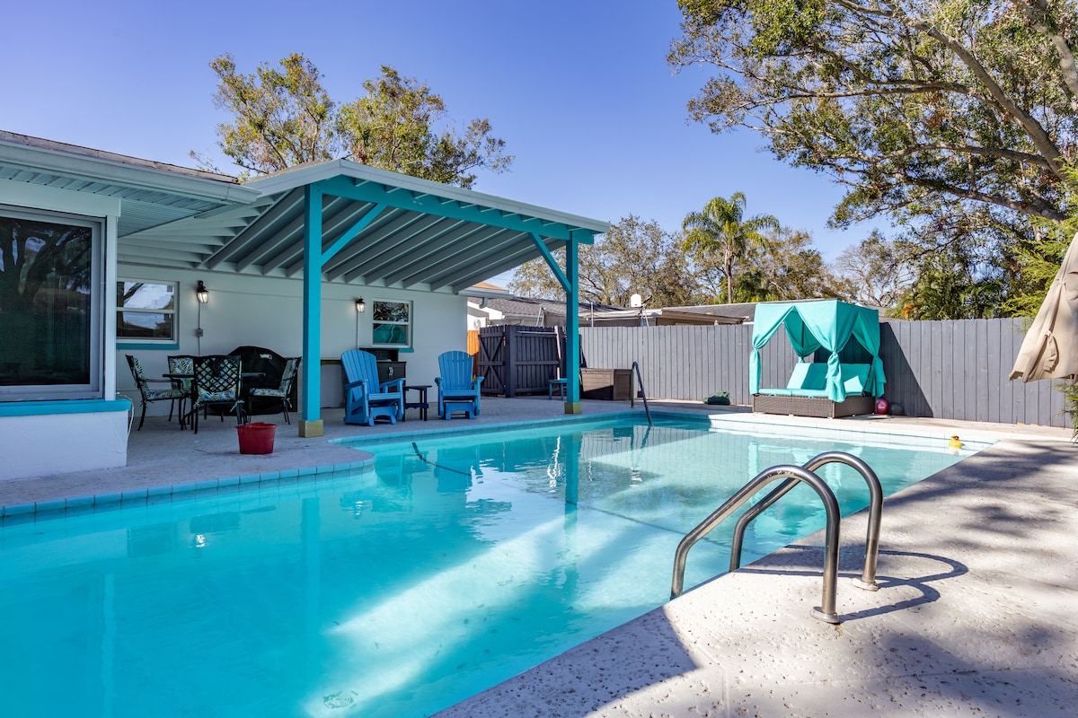 Experience resort-style living in this 3BR, 2BA Largo home with a heated pool, gazebo, outdoor cinema, mini golf, ping-pong, foosball, darts & more. Just 6 miles to Indian Rocks & Clearwater Beach and 5 mins to restaurants, Walmart & Publix. Enjoy a gourmet kitchen, game room, gym, hammock, BBQ patio & easy access to Florida Botanical Gardens, Heritage Village, parks & family fun. Perfect for guests seeking luxury near Gulf Coast beaches. Relax or play—this home has something for everyone.