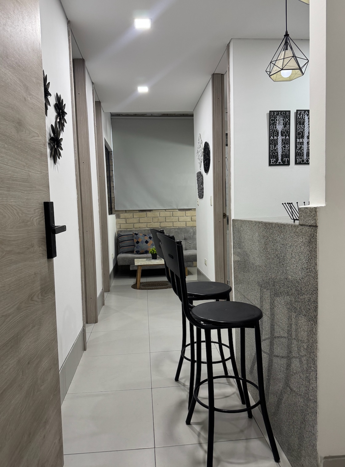Bel appartement d'une chambre, entièrement équipé : lit double et un lit simple (lit gigogne), cuisine intégrée, garde-manger, salle de bain, salon. Climatisation dans la chambre, TV 40", télévision par satellite, micro-ondes, lave-linge, réfrigérateur. WiFi 300 Mb. Disponible pour le Carnaval, vous devez prendre les quatre jours. Parking couvert. Situé à Ciudad Jardín, à proximité de Comfamiliar del Norte, de l'Université métropolitaine et du parc Sagrado Corazón.