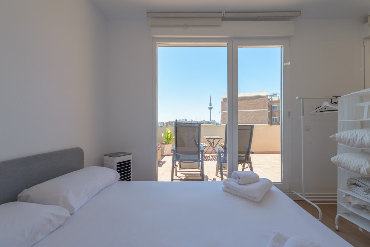Apt. 2 pieces de 50 m² baigné de lumière avec vue impressionnante du centre ville depuis votre terrasse privée. Cet appartement jouit d’un emplacement privilégié dans un quartier calme, mais branché appelé Conde Duque. Situé a quelques pas de Malasaña, Chueca, le Palais Royal, Plaza de España et Gran Via, vous pourrez faire toutes vos visites a pieds. Réformé par un cabinet d’architecte il offre tous le confort moderne dans un style industriel. Le Wifi est rapide.