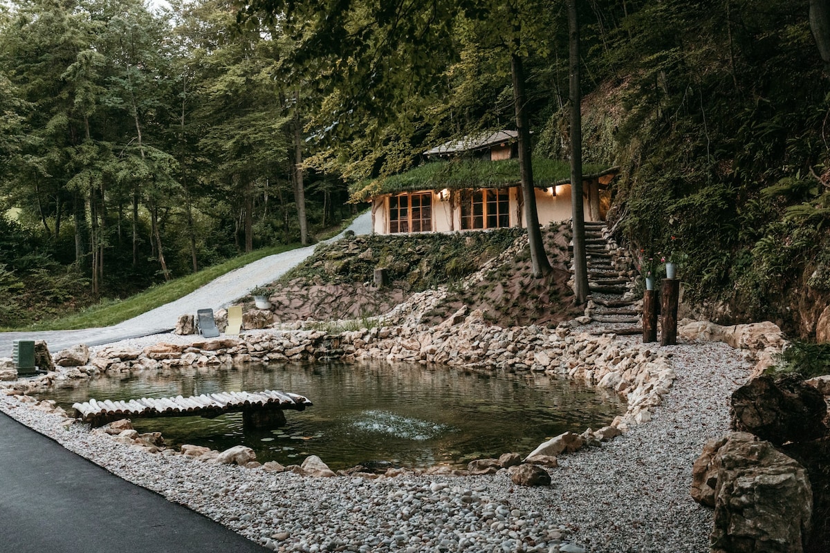 Forest Luxe Retreat is a handcrafted luxury cabin hidden in the forest on a private eco farm. Enjoy your own crystal-clear pond, private sauna and outdoor jacuzzi. Surrounded by horses, goats and organic gardens, it’s perfect for couples and families. Children can explore nature and use shared playgrounds, while adults relax in total privacy. A peaceful wellness escape and authentic farm experience in one unforgettable stay.