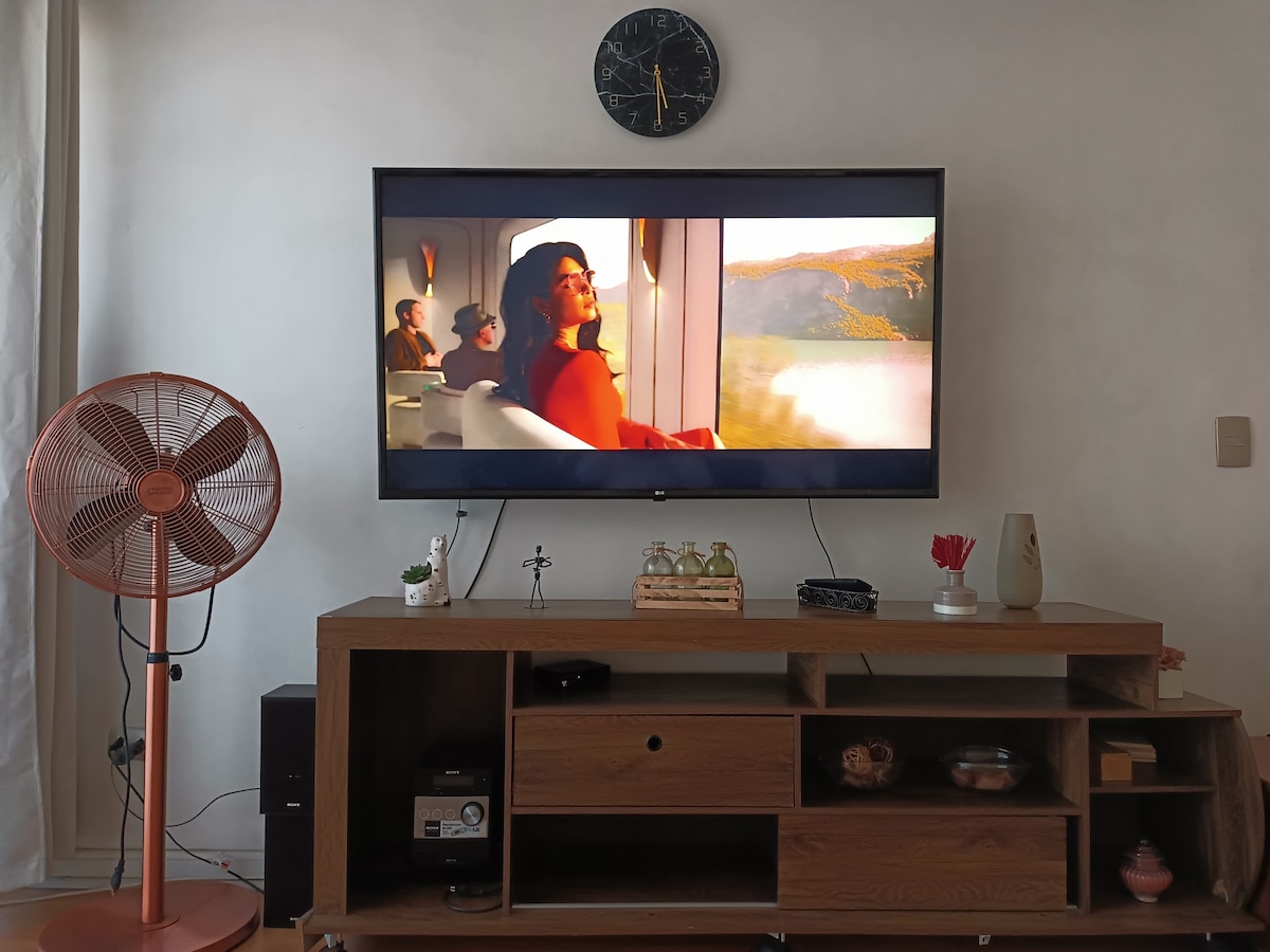 This apartment is ideal for relaxing and enjoying the city. It's centrally located, between the Santiago Centro and Providencia districts, one of the best locations in the city. It offers beautiful views of San Cristóbal Hill and the Sky Costanera. It's just a 3-minute walk from the metro and buses. Includes: Free Wi-Fi, a fully equipped kitchen, sheets and towels included, a large bed with a large Smart TV. Self-service entrance with a key, allowing you to arrive at any time.