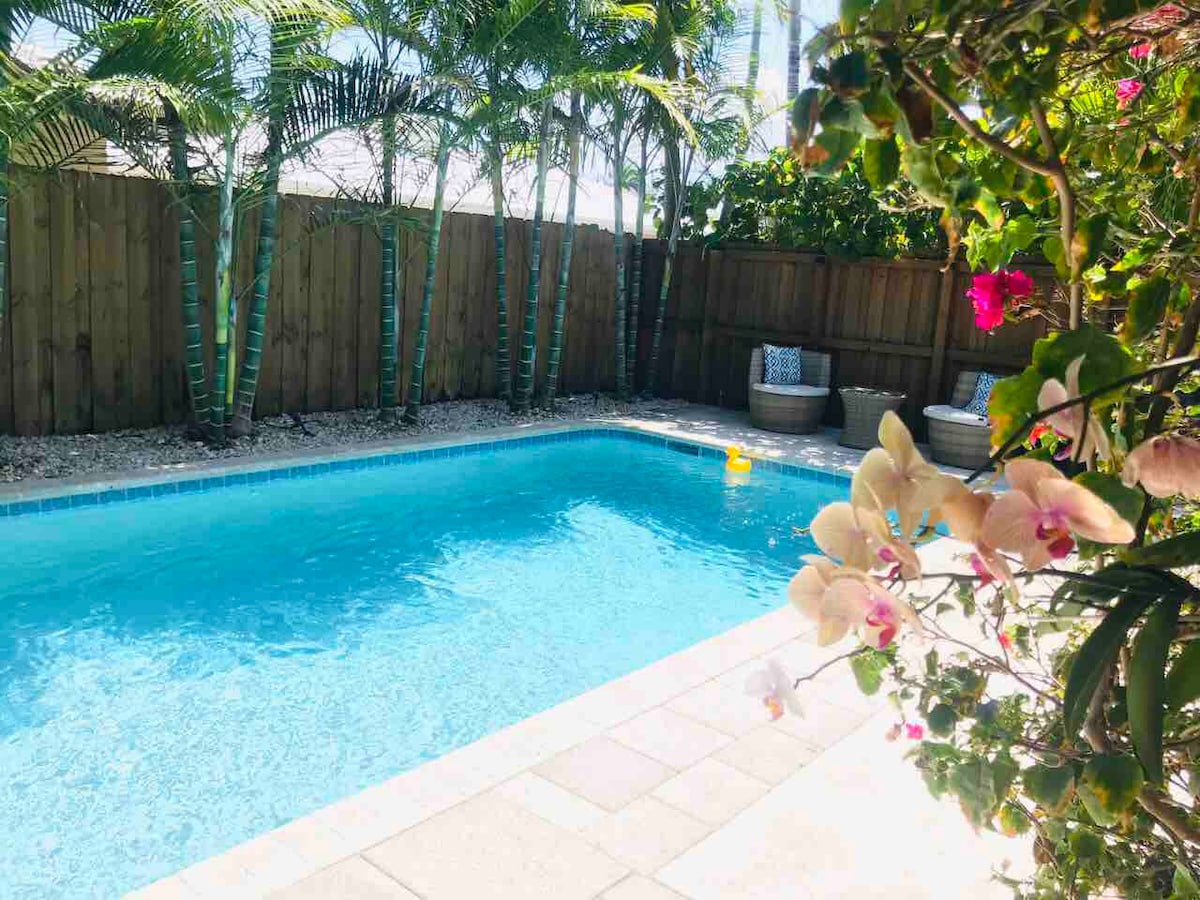 Le logement le plus souvent enregistré en favori sur Airbnb à Broward ! Notre studio confortable dispose d'une cuisine et d'une salle de bain entièrement équipées et de nombreux extras ! Entrées privées avant et arrière. Espace piscine tropicale (partagé) avec une ambiance de complexe hôtelier juste derrière la porte. Proche des plages, de l'aéroport, du port, etc. Convient à 2 personnes avec un lit Queen confortable. Marchez jusqu'à d'excellents restaurants et barbecue disponibles pour 5 $ . Superhôtes expérimentés sur place avec plus de 12 ans d'expérience et plus de 2 800 commentaires. Venez nous rejoindre dans notre complexe Airbnb ! Le studio se trouve à droite de la photo aérienne.