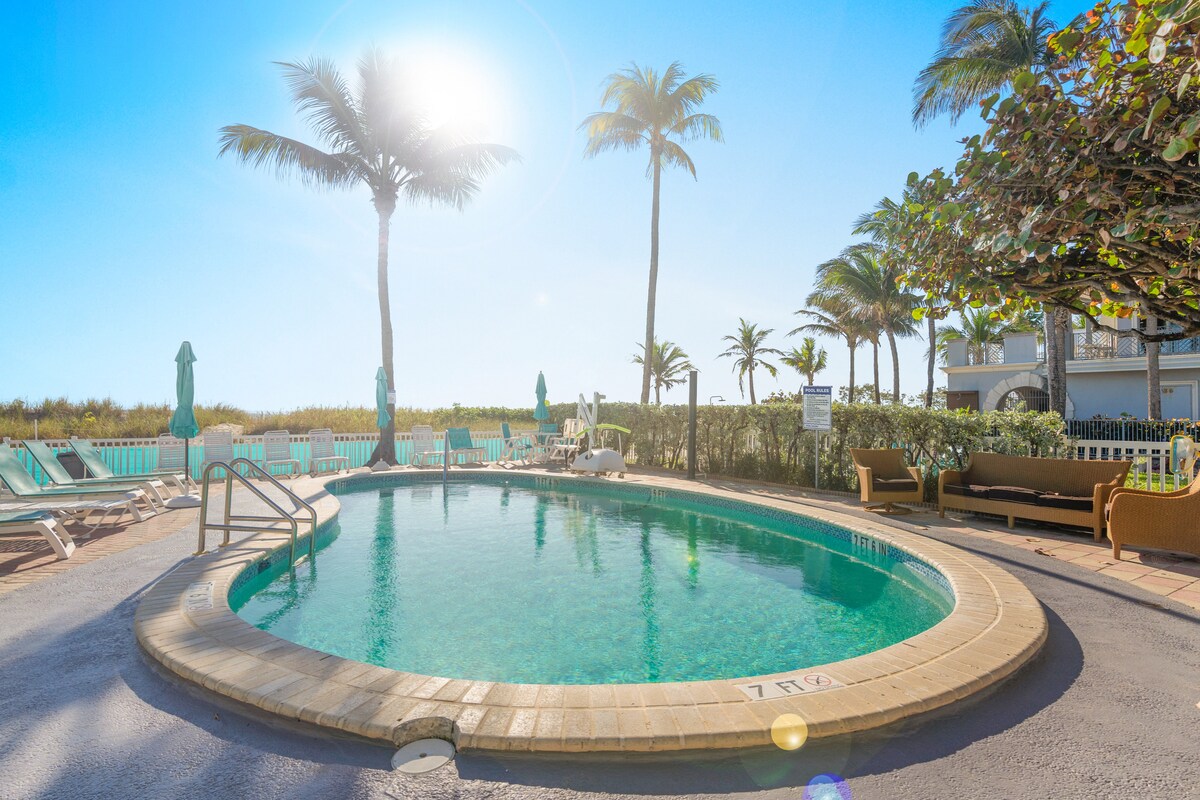 Magnifique condo 1 chambre situé directement sur l'intracoastal avec une piscine chauffée. Cet appareil N'A PAS de vue sur l'eau depuis le condo, MAIS offre une vue incroyable sur la voie navigable intracôtière depuis la terrasse/piscine. Profitez de regarder les yachts naviguer tout en prenant des couchers de soleil étonnants depuis le quai. Travail à domicile, à 1 pâté de maisons de la plage! Calme et paisible. À quelques minutes à pied de nombreux commerces et équipements locaux! Parfait pour les couples, les jeunes familles et les groupes d'amis voyageant ensemble.
