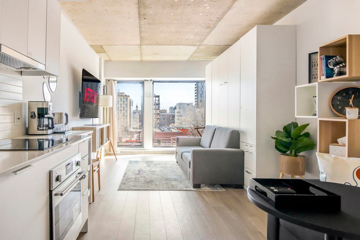 Appartement de style condo de 420 pieds carrés, moderne et lumineux. Que ce soit pour le loisir ou le travail, c’est facile de prendre ses aises quand tout ce qu’on cherche est à portée de la main. Vous avez accès à un balcon privé avec vue sur le centre-ville. Une pièce d'identité et une carte de crédit valide sont requises pour effectuer l’enregistrement. Une pré-autorisation de 250,00$ est capturé lors de votre enregistrement. CITQ: 300840