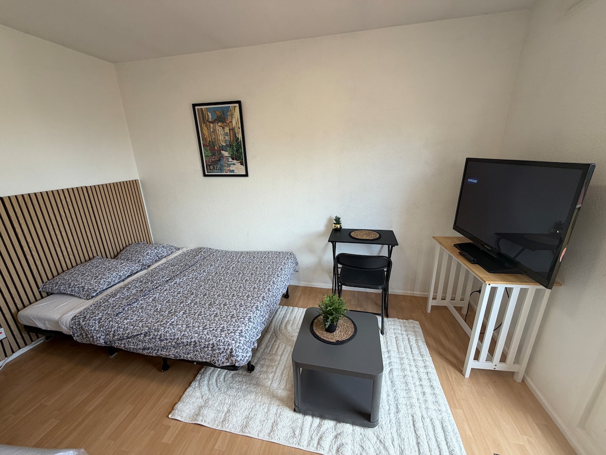 Bienvenue au Studio René ! Cosy et élégant, il rendra votre séjour à Metz très confortable. Situé dans un quartier près du centre de Metz, vous pourrez vous garer gratuitement au pied de l'immeuble. Le studio est parfaitement équipé que vous y restiez une nuit ou une semaine, c'est comme à l'hôtel mais en mieux. Tout équipé, ce studio refait à neuf saura accueillir jusqu'à 2 adultes et un bébé (équipement bébé sur demande).