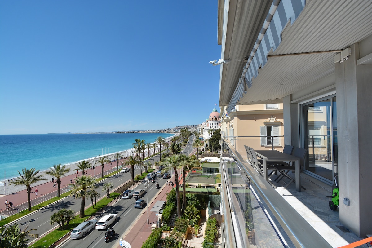 Une localisation unique face à la mer dans un cadre enchanteur, à 20m de l'hotel Negresco, du Westminster concorde, du méridien, face à la mer. Vous trouverez tous les commerces aux pieds de l'immeuble, le bus liaison direct avec l'aéroport en bas de l'immeuble, les plages en face, la zone piétonne à 50m, les restaurants, les boutiques et surtout le vieux nice. Le logement 3p de 88m² est tout confort, une grande terrasse, le wifi et surtout complétement rénové possible lit de bébé et chaise bébé