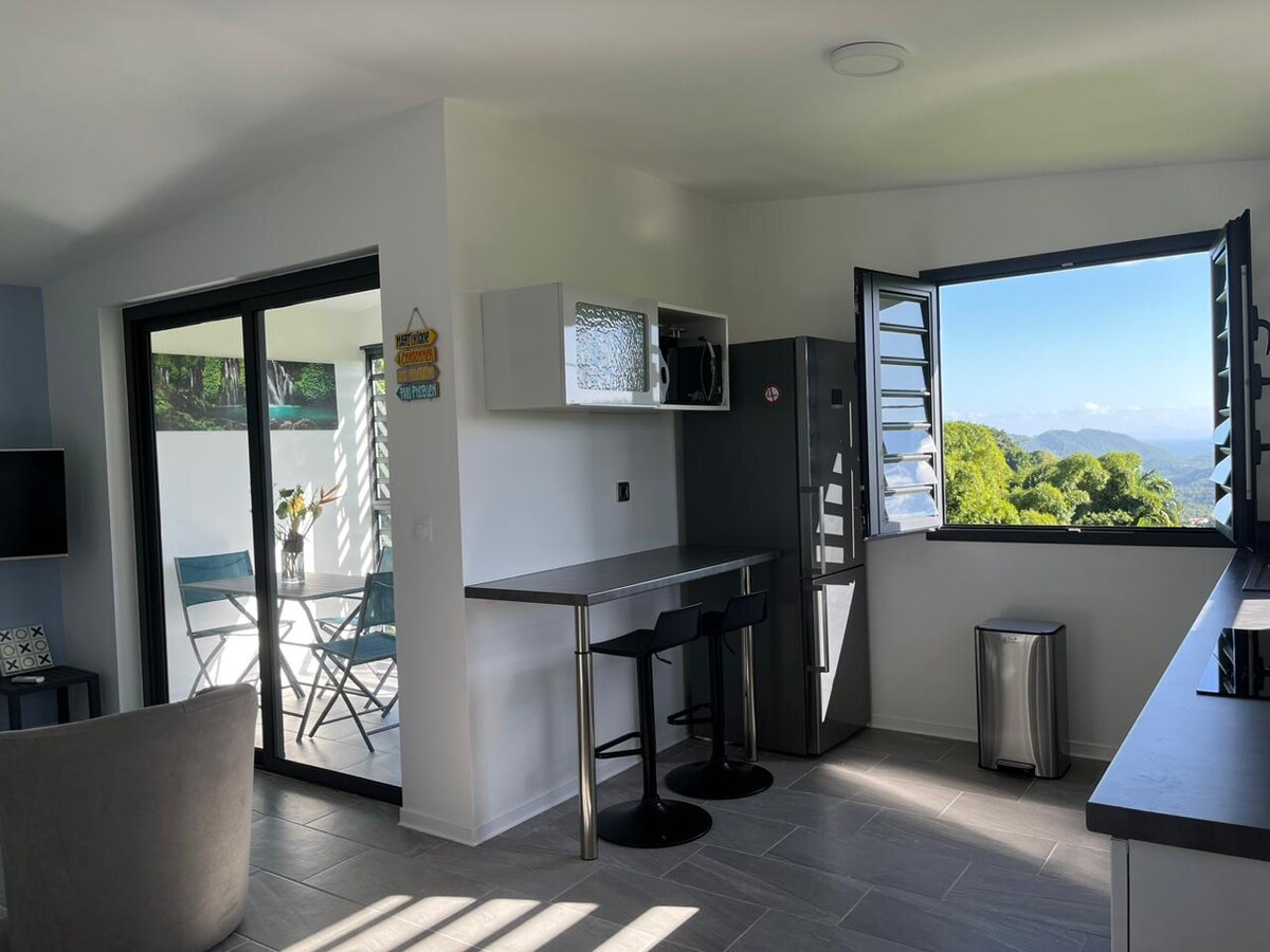 Appartement neuf, arboré avec vue sur mer et l’horizon. Cadre apaisant, relaxant sans vis à vis Wifi, chaines câblées et Netflix Vue sur mer et rocher du Diamant Un coucher de soleil imprenable et différent chaque jour Proche de la plage avec ses mini marché de fruits et légumes, snacks, crêperie et restaurants (5 mn à pieds), des commerces (8 min en voiture) Situé au sud de l'île, sur la route des plages, du Marin et de sa marina Parking et entrée privée Hôtes disponibles et accessibles
