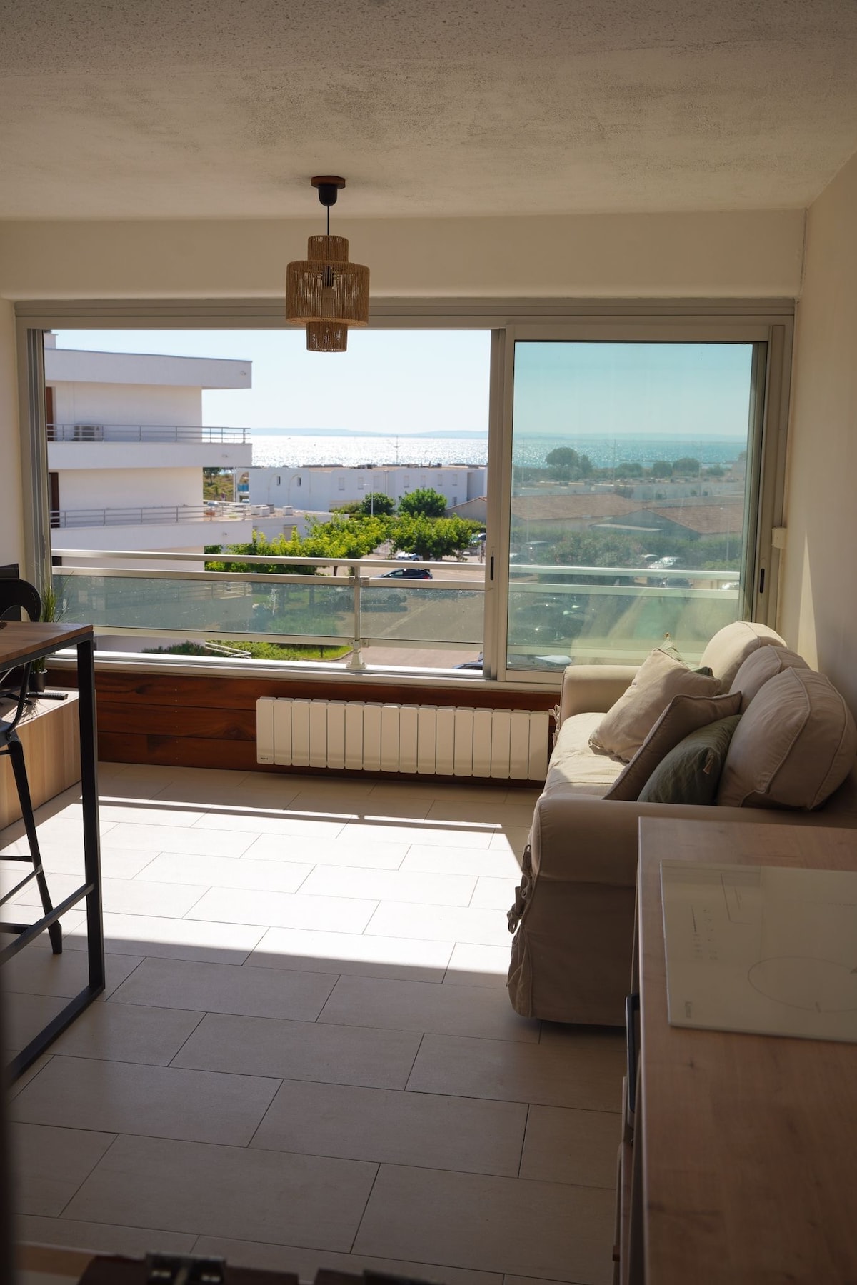 Grand P2 59m2, Port Camargue, très bien situé, à 50 m de la plage, 100m de tous commerces, vous apprécierez la vue parfaitement dégagée sur la mer. Vous serez au 2ème & dernier étage, au calme, à l’extrémité de la résidence. Parfaitement rénové, confort (Insonorisé, wifi fibre 100M, clim), super équipé, beaux volumes (chambre de 17m²) une chambrette avec 2 lits superposés enfants, et vue mer. Décoration actuelle, confortable. Rien ne manque. Parking sécurisé. Une véritable détente !