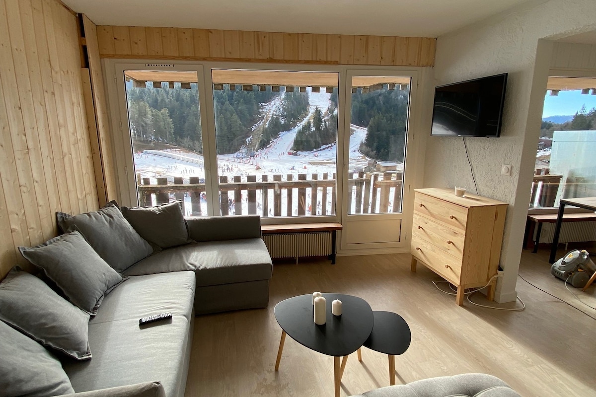 40m2 exposé Sud-Ouest : entrée, séjour cuisine, double-loggia vitré avec canapé, 1 chambre, lit double, simple, gigogne, 1salle de bain Idéal de 1 à 3 pers, poss 5 Situé dans une résidence très calme du secteur arboré Rocher du Cerf, à proximité des sentiers de rando-trails, 200m des pistes de ski/Vtt >Place de parking privée les moins du lieu : > Pas de cafetière > Draps et serviettes non fournis Pas de supplément ménage mais je vous serais reconnaissante de laisser l appart rangé etpropre
