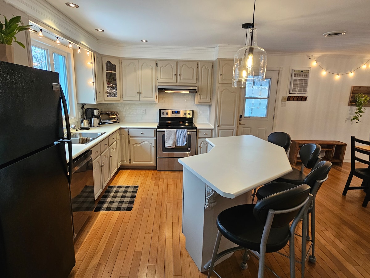 ***PROMOTION février 2025 Louez 3 nuits consécutives et nous vous rembourserons 10% du montant total de votre réservation.*** Superbe petit bachelor de 300pi2 intime et tout meublé à proximité de tous les services. Planchers chauffants, douche en céramique avec jets masseurs, cafetière Kurig, literies et cuisine autonome. Plaques à induction et Air Fryer. Wi-fi et Télévision intelligente. « Bell télé Fibe » disponible. Restaurants, épicerie, dépanneurs, pistes cyclable à proximité.
