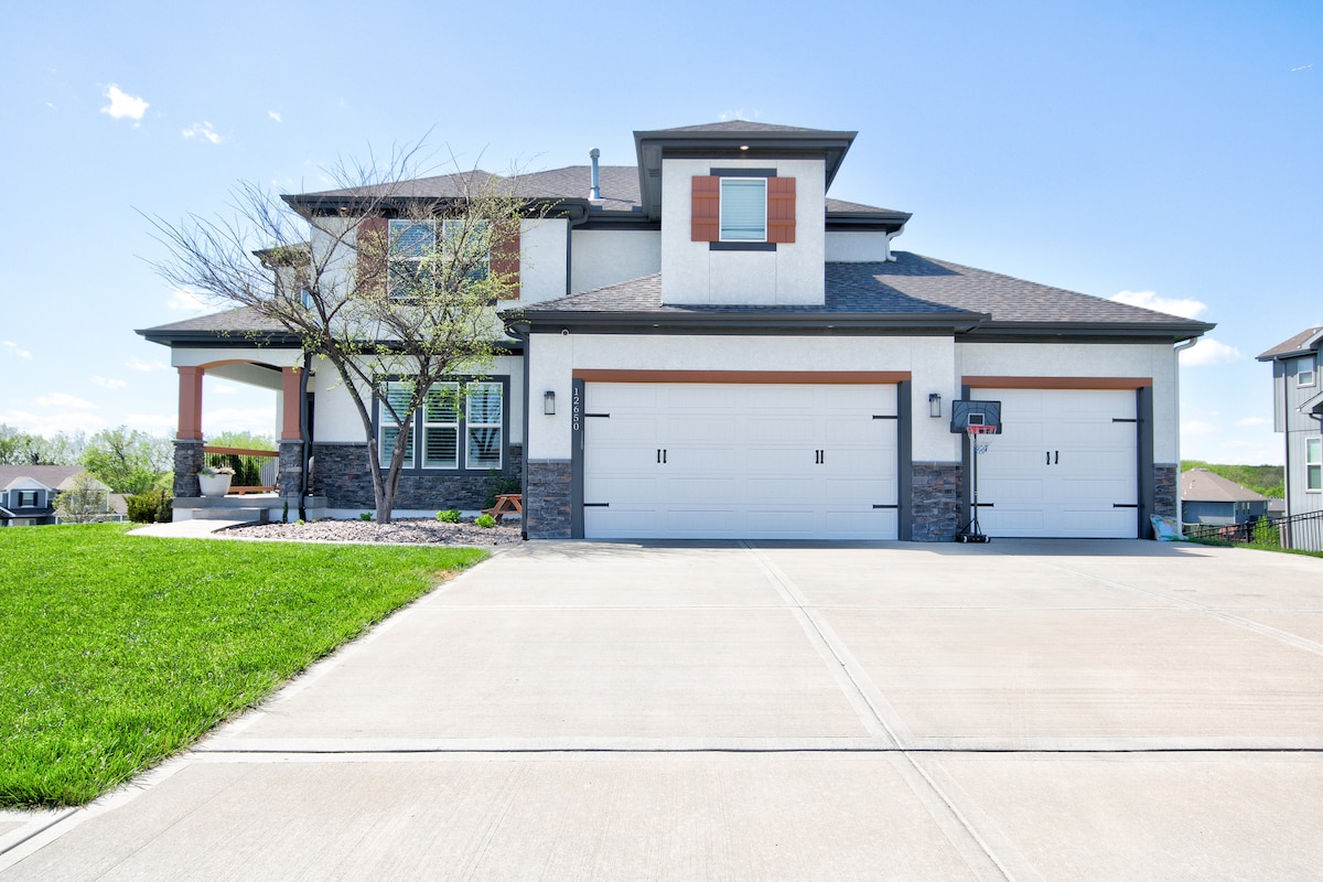 Retraite spacieuse sur trois niveaux dans le Village West Entertainment District, à quelques minutes des Legends Outlets, du Kansas Speedway, du Sporting KC, du golf, des restaurants et des magasins. Peut accueillir jusqu’à 14 personnes avec 4 chambres, un coin nuit en mezzanine et 4 salles de bains complètes avec bidets. Profitez d’un terrain de sport pour le pickleball/le basket-ball, d’un spa avec piscine, d’une salle de sport, d’une borne d’arcade, d’une table de billard, d’une table de ping-pong, de fléchettes, d’un jeu de palets, d’un minigolf et bien plus encore. Surplombe le terrain de golf Sunflower Hills.