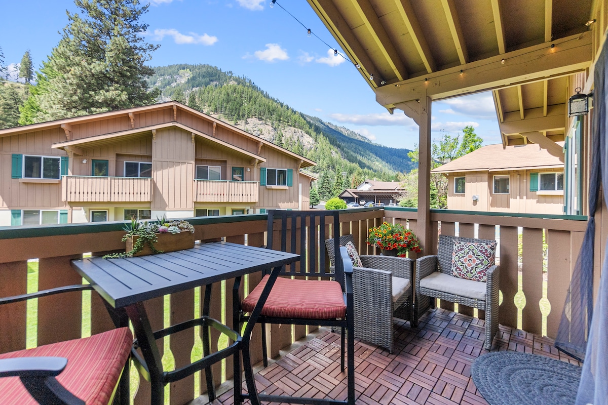 Condo confortable situé dans les pins, un emplacement idéal à seulement 15 minutes à pied du centre-ville de Leavenworth ! Peut accueillir confortablement 4 personnes, 2 chambres avec lits queen, 2 salles de bains. Salon confortable avec télévision intelligente de 55", foyer au gaz et jeux pour se divertir. Une cuisine entièrement équipée avec casseroles/poêles et ingrédients pour tous vos besoins de cuisine et de pâtisserie, avec lave-linge/sèche-linge et une terrasse avec vue sur la montagne ! * La cheminée est saisonnière et n'est opérationnelle que pendant les mois d'automne et d'hiver.