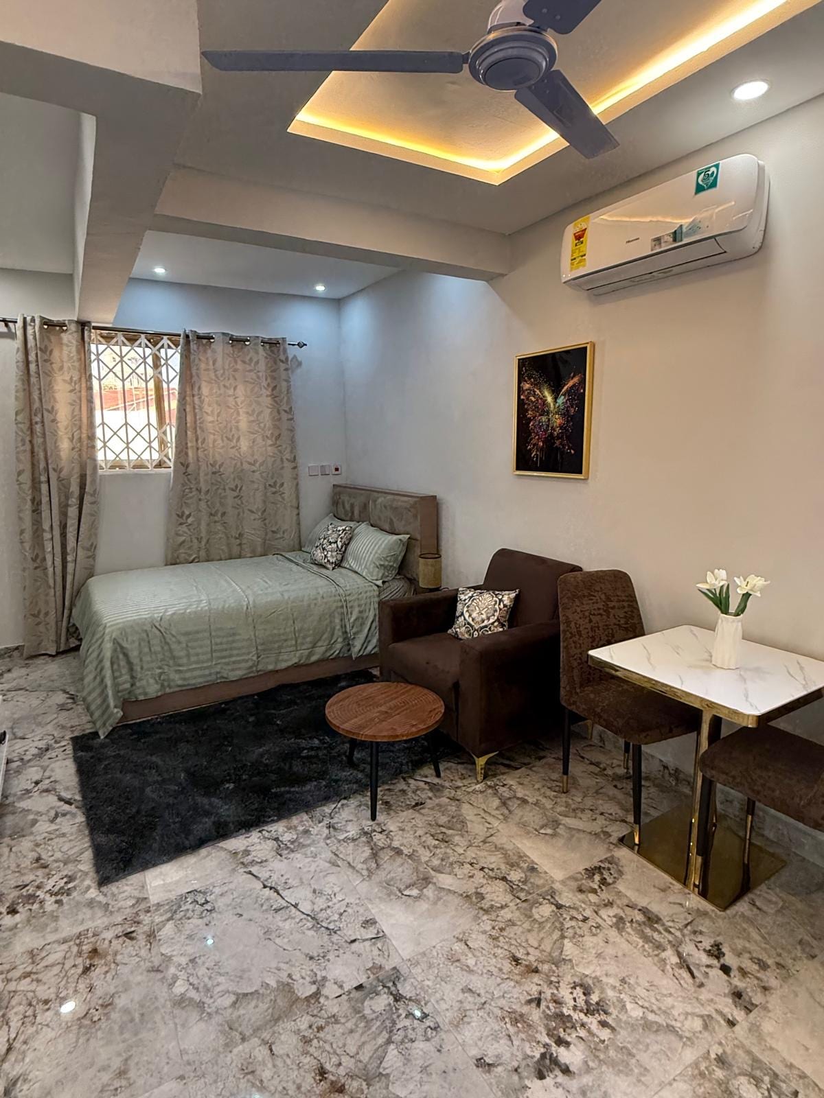 Situé à Greda Estates près de Spintex, ce studio privé propre est à seulement 5 miles de l'aéroport, idéal pour des séjours courts ou longs et des voyages d'affaires. Profitez d'un lit confortable, d'une télévision connectée avec Netflix, de la climatisation, de stores filtrant la lumière, d'un mini-réfrigérateur, d'un four à micro-ondes, d'une bouilloire, d'une douche chaude et d'une connexion Wi-Fi rapide. Enceinte sécurisée avec parking sur place. Cuisine et buanderie partagées disponibles. Parfait pour les voyageurs en solo, les couples et les télétravailleurs. Réductions hebdomadaires ou mensuelles disponibles.