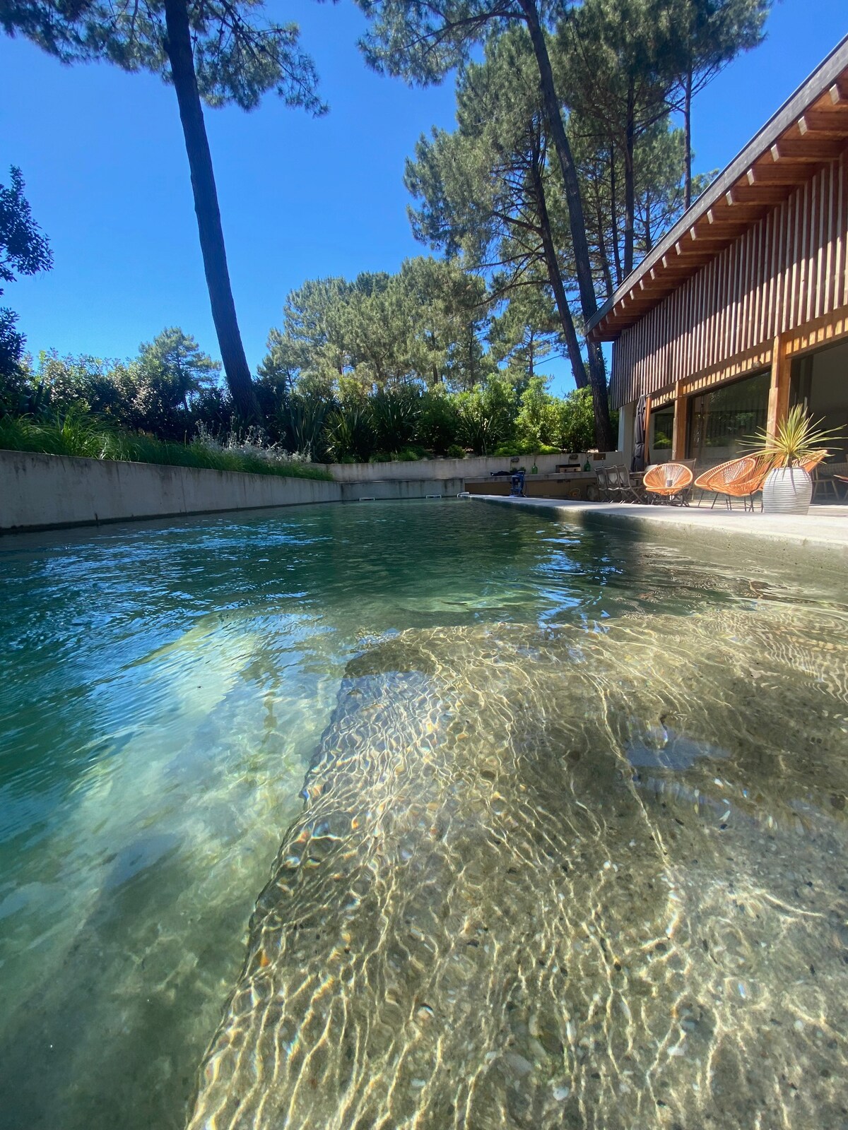 Villa d'architecte proposée pour 10 couchages, climatisée. Située à moins de 5 min à pieds des commerce de proximité et des plages du bassin d’Arcachon (village Grand Piquey). voiture nécessaire pour aller sur les plages Océanes en 5 min (15 min du centre du cap ferret) Piscine chauffée de 15m chauffée du 15 Mai au 15 Septembre selon conditions climatiques et intempéries (avant et après cette période , elle est hivernée et/ou bâchée) un véritable cocon de verdure