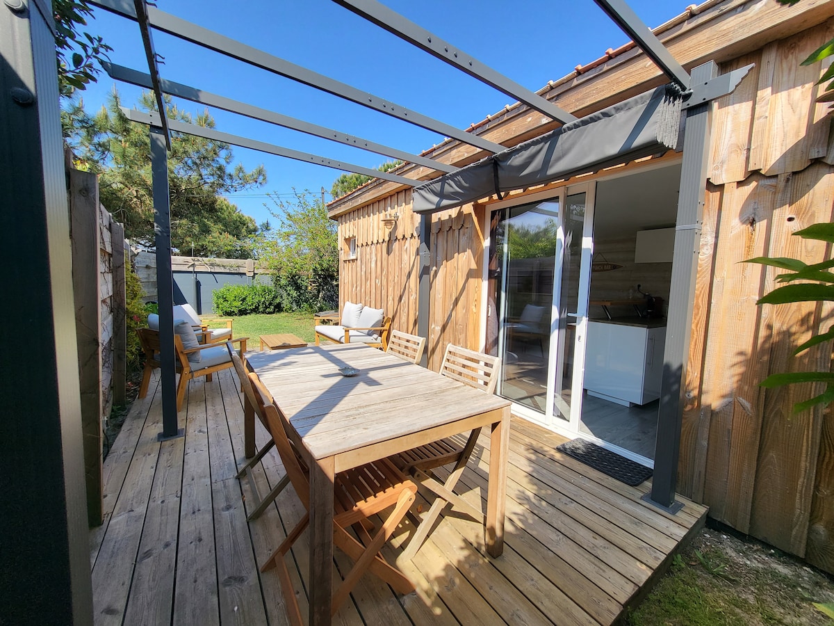 Beach House est une dépendance d'une maison d'architecte avec garage en bois brulé qui vous propose un environnement de choix avec une discrétion assurée et une convivialité promise. Vous serez indépendants avec une terrasse privée et un confort cosy. Nous serions ravis de vous recevoir dans cette petite maison du bonheur pleine de charme aux portes de l'océan. à 4 kms de l'océan et à 3 kms du bassin d'Arcachon. Le Cap Ferret est à 13 kms traversant les pittoresques villages ostréicoles