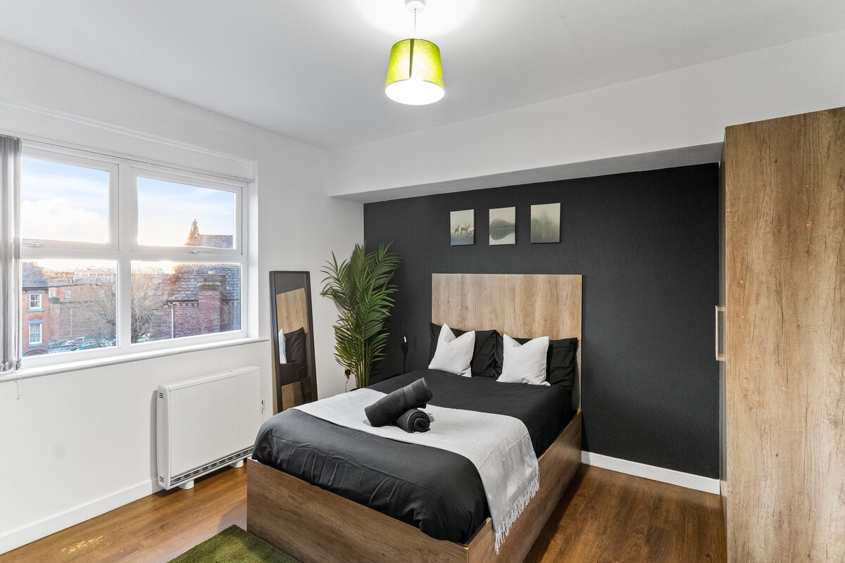 Appartement de luxe sur la verdoyante New Walk avec vue panoramique sur Museum Square depuis la chambre et le salon à travers les fenêtres à guillotine. Réveillez-vous dans un lit king size orné de draps en coton égyptien. Machine à café et cuisine entièrement équipée, idéale pour cuisiner un dîner anglais complet ou rôti, avec vue sur le musée. Télévision 4K 65" avec Netflix. Éclairage doux, douche à effet pluie. À 5 minutes de la gare ; De Montfort Hall 10, Curve 8, Tigers Stadium 12 minutes. Havre paisible et élégant sur le joyau de Leicester, New Walk 🍃