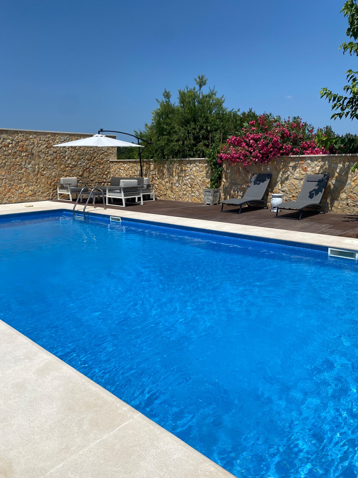 Suite privée au 1er étage (R/C), parfaite pour un couple ou une petite famille. Vous aurez une cuisine, une salle de bain et un petit salon/une petite chambre. La maison est située sur deux acres avec des tonnes d'arbres fruitiers, une oliveraie, une belle piscine et un beau salon extérieur. Bien que la piscine partagée soit disponible jusqu'en novembre, l'eau est plus fraîche lorsque les jours sont moins ensoleillés, et peut être froide en hiver ! Nous avons beaucoup d'orangers, de citronniers et de tonnes de figuiers. N'hésitez pas à choisir !