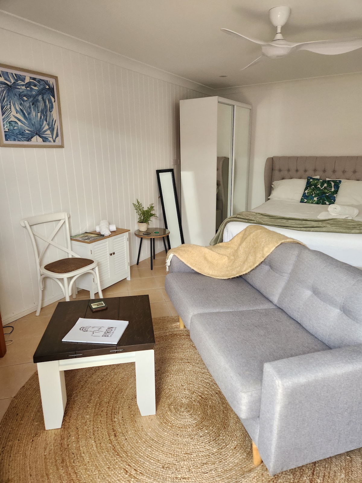 Détendez-vous lors de cette escapade unique et tranquille. Il y a un bus qui s'arrête de l'autre côté de la route et vous emmène à travers Lennox Head jusqu'à Byron Bay et Mullumbimby. Le studio est à cinq minutes à pied de l'océan dans un quartier calme entre Lennox Head et Ballina. Il y a un parking à l'avant et de belles promenades dans les environs. Le studio est insonorisé et il y a des équipements de cuisine si vous voulez passer du temps à la maison. Il y a une belle terrasse pour les boissons de l'après-midi. Le wifi est optus 020...mot de passe lakes24243kd