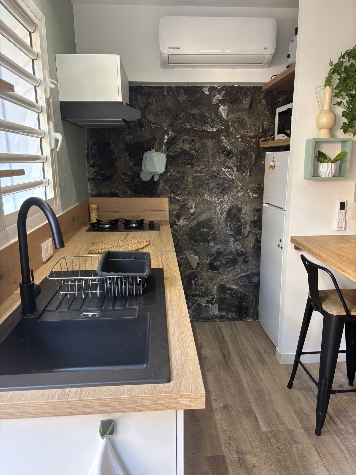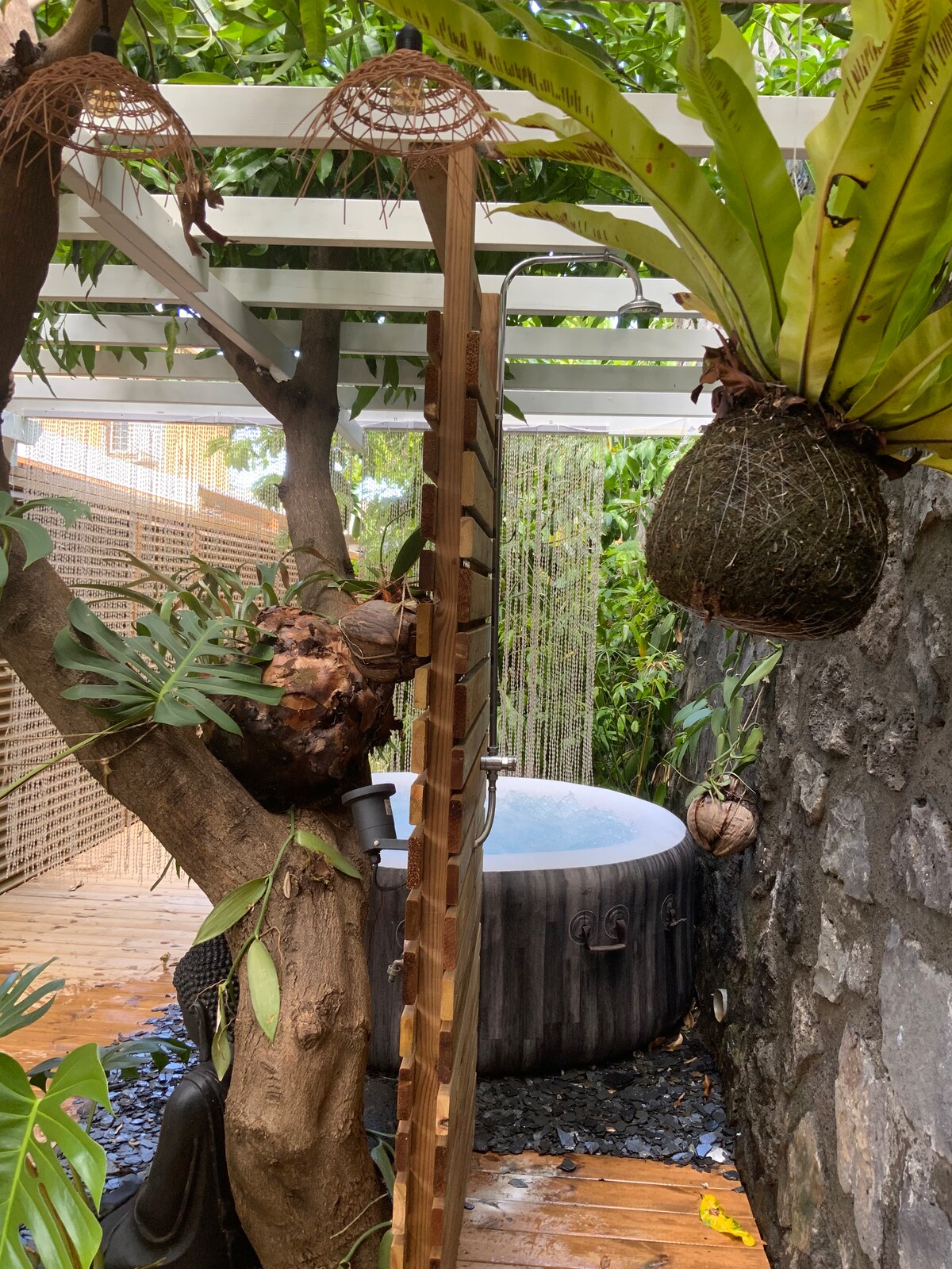 Studio tout équipé climatisé avec cuisine dont machine a café Nespresso, salle de bains avec douche italienne, wc, parking privé, dressing, petit salon, wifi, télévision, 2 terrasses extérieures privées, une à l'entrée à proximité du spa dotée d'un salon et une autre immergée dans la forêt. Vous êtes dans un cocon coupé du monde dans la faune et la flore réunionnaise. Possibilité de garer votre véhicule en toute sécurité dans la cour. Accès au spa complètement privatisé
