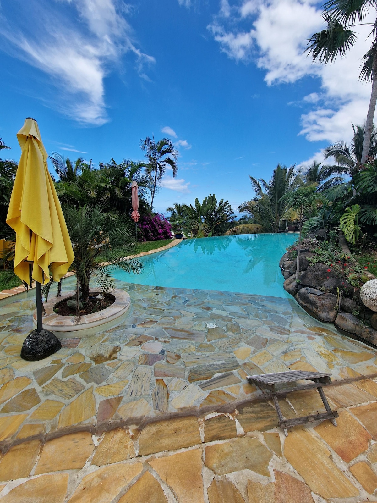 Face à la baie de l’Étang-Salé-les-Bains, Villa Samaé est une maison lumineuse, ouverte sur l’océan et entourée d’un grand jardin tropical. Terrasses en bois face au large, coins lounge sous les cocotiers, spa en pierre naturelle et grande piscine rythment les journées, dans une atmosphère douce mêlant influences asiatiques et créoles. Idéalement située entre Saint-Pierre et Saint-Gilles les bains pour rayonner dans l’île et à 10 minutes de la plage. Non adaptée aux PMR et enfants -10 ans