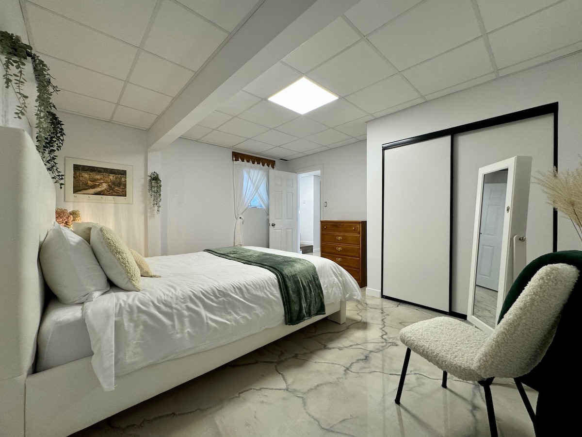 Évadez-vous dans cette suite lumineuse et confortable dans le sous-sol du Vieux-Chelsea ! Profitez d'un matelas confortable en mémoire de forme Casper, d'une cuisine entièrement équipée, d'une connexion Wi-Fi ultra-rapide, d'un poste de travail et d'un stationnement gratuit. À proximité, vous trouverez des cafés, des restaurants, le Nordik Spa et le parc de la Gatineau pour les activités de plein air. Ottawa est à seulement 10 minutes pour la culture et le divertissement. Avec la climatisation, la buanderie et l'entrée sans clé, vous aurez tout ce dont vous avez besoin pour un séjour sans stress. Entrée partagée et les hôtes occupent les étages supérieurs.
