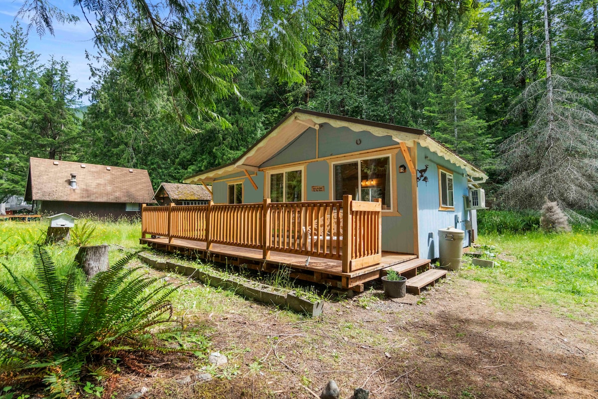 Détendez-vous dans ce logement unique et tranquille. Dans cette location de vacances rustique et confortable de 2 chambres et 1 salle de bain, tout ce dont vous aurez besoin pour une escapade relaxante, c'est vous et vos proches (amis à fourrure inclus). De jour, explorez des sentiers de randonnée à couper le souffle dans le parc national du mont Rainier, et le soir, offrez à vos jambes endolories un bain réparateur dans le jacuzzi privé du chalet. Cette charmante cabane se trouve à un emplacement qui permet de se rendre à pied aux restaurants et à quelques pas du centre-ville d'Ashford et de la rivière Nisqually.