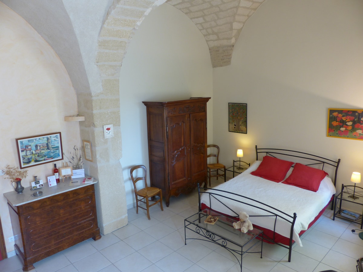 Dans maison de charme aux grands volumes, 12km de Montpellier, chambre très spacieuse climatisée avec salle de bain privative attenante en B&B. Entrée indépendante. Parce que notre santé est aussi la votre, nous vous accueillons dans le respect des gestes barrières.