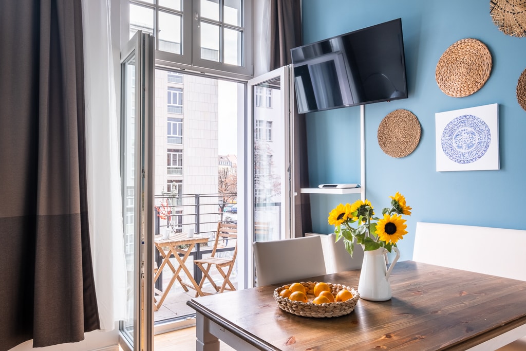 You live in one of the most expensive districts: Berlin Mitte. The modern 75 m² one-bedroom apartment features a living room, a sunny south-facing balcony, a modern kitchen and a bedroom with a king-size double bed. In the living room there is a sofa bed that can be converted into a double bed. A bathroom with a large shower. The apartment is 2 stops from the train station. The subway and tram can be reached in about 2 minutes.